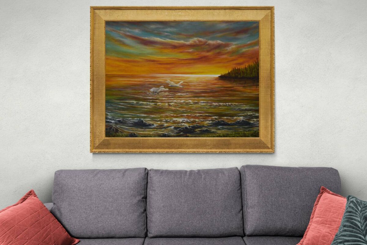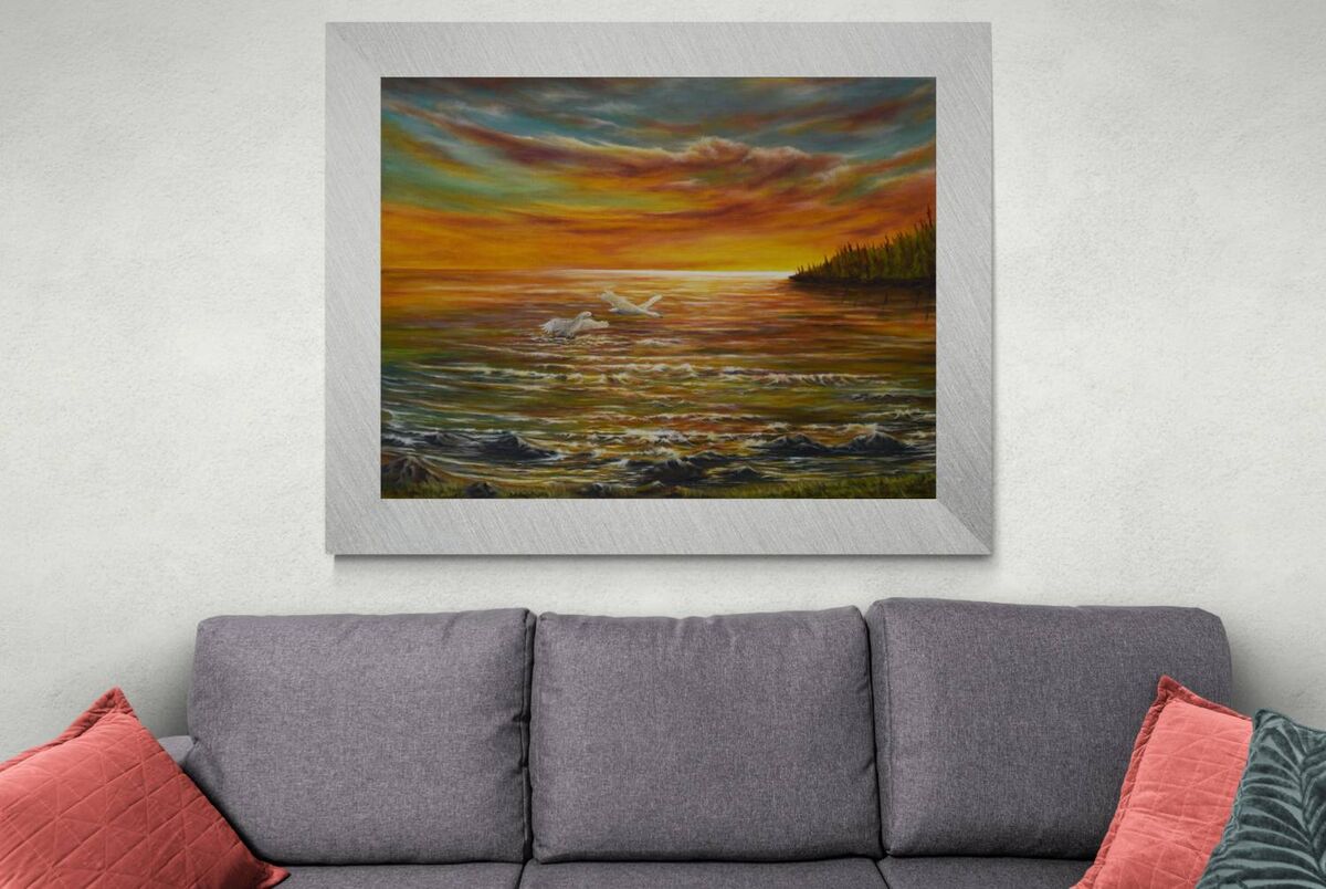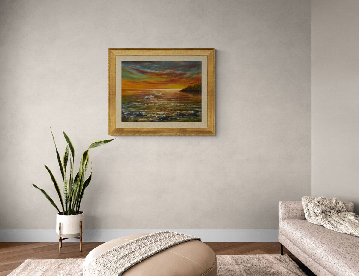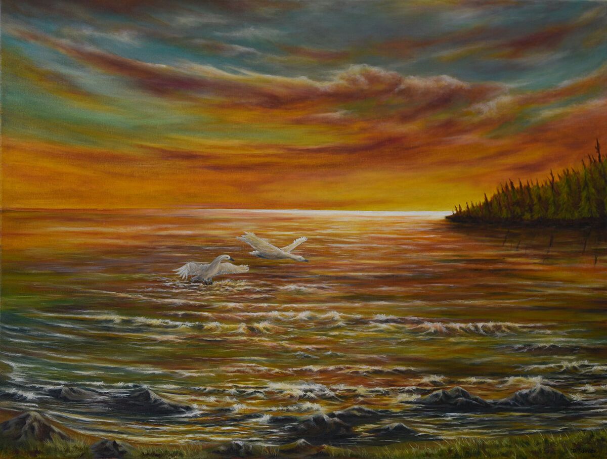 Original painting depicting the midnight sun over a finnish lake during the summer solstice. Prints available.