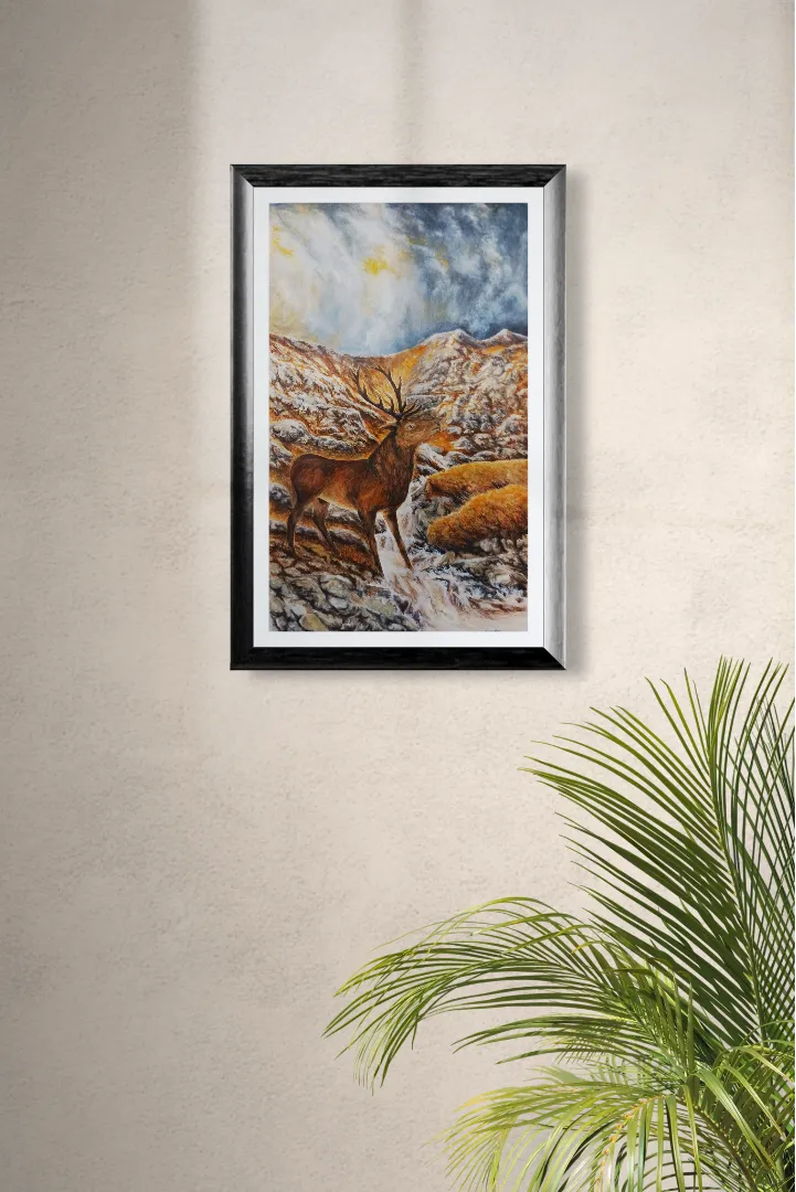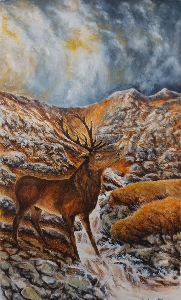 Explore the untamed beauty of the Highlands in "The Young Pretender," a watercolor (55.5 x 37.5 cm) depicting a Highland stag during the October rut. Skillful brushstrokes breathe life into the regal stag, vividly portraying the raw intensity of this natural spectacle. Available for purchase in its original form, "The Young Pretender" also offers prints, allowing you to adorn your space with the noble spirit of the Highlands. The delicate watercolor hues and dynamic portrayal make this artwork a captivating ode to Scotland's wildlife.